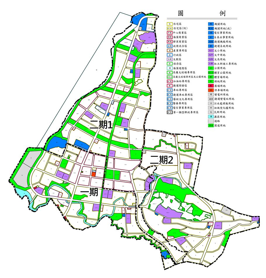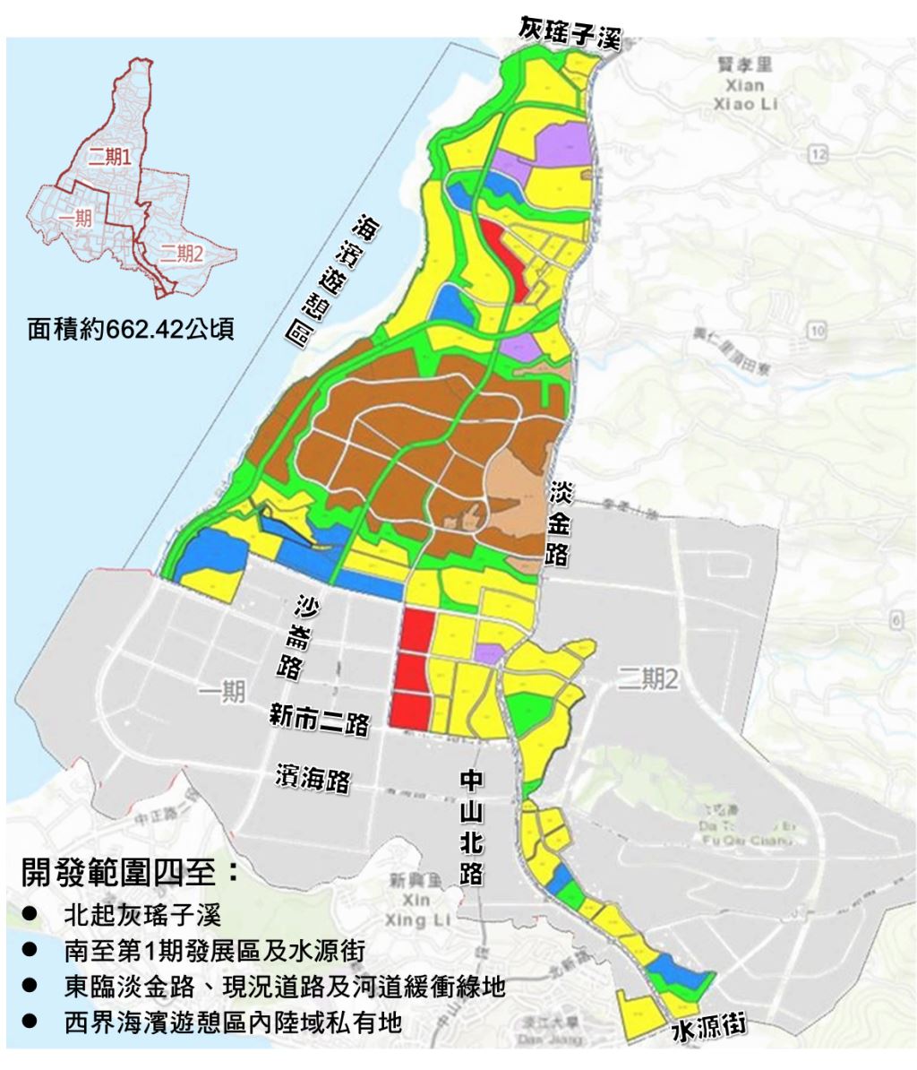 淡海新市鎮第2期發展區第1開發區位處淡海新市鎮西北區,目前規劃面積約662.42公頃。